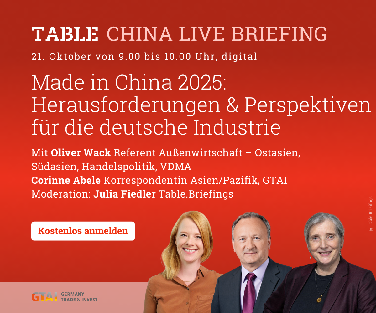 Chinas Industriepolitik „Made in China 2025“ wirkt sich spürbar auf deutsche Schlüsselbranchen aus, darunter der Maschinenbau. Im Gespräch mit Julia Fiedler von China.Table analysieren Corinne Abele (GTAI) und Oliver Wack (VDMA), in welchen Bereichen chinesische Unternehmen besondere Wettbewerbsstärke entwickelt haben und wo die größten Herausforderungen insbesondere für den deutschen Maschinenbau liegen. Welche Handlungsoptionen sollten Unternehmen und Politik vor dem Hintergrund eines Wettbewerbs verfolgen, der sich zunehmend auch auf Drittmärkte verlagert?