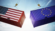 Trade wars concept with American and EU flag textured cargo containers clashing. 3D illustration