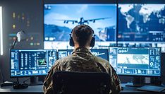 a soldier starring at monitors controlling a drone from a tactical control room.