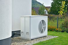 Wärmepumpe, Klimaanlage, Luftwärmepumpe für Heizung und Warmwasser vor einem neu gebauten Wohnhaus