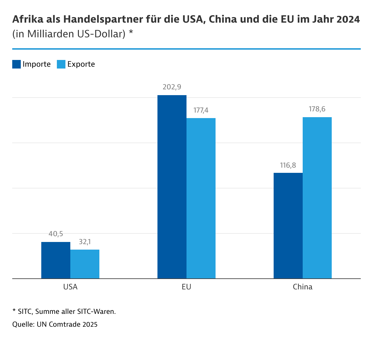 Realistischer erscheint es, dass sich afrikanische Staaten verstärkt anderen Absatzmärkten zuwenden, darunter China, der EU, Indien und den Vereinigten Arabischen Emiraten. China verkündete im Juni 2025, dass es 53 afrikanischen Nationen einen zollfreien Zugang zum chinesischen Markt gewährt. Was wie eine großzügige Geste erschien, ist längst überfällig. Denn im Handel mit Afrika erwirtschaftet China einen riesigen Exportüberschuss und verhindert damit indirekt die Entwicklung von Industrien in Afrika.