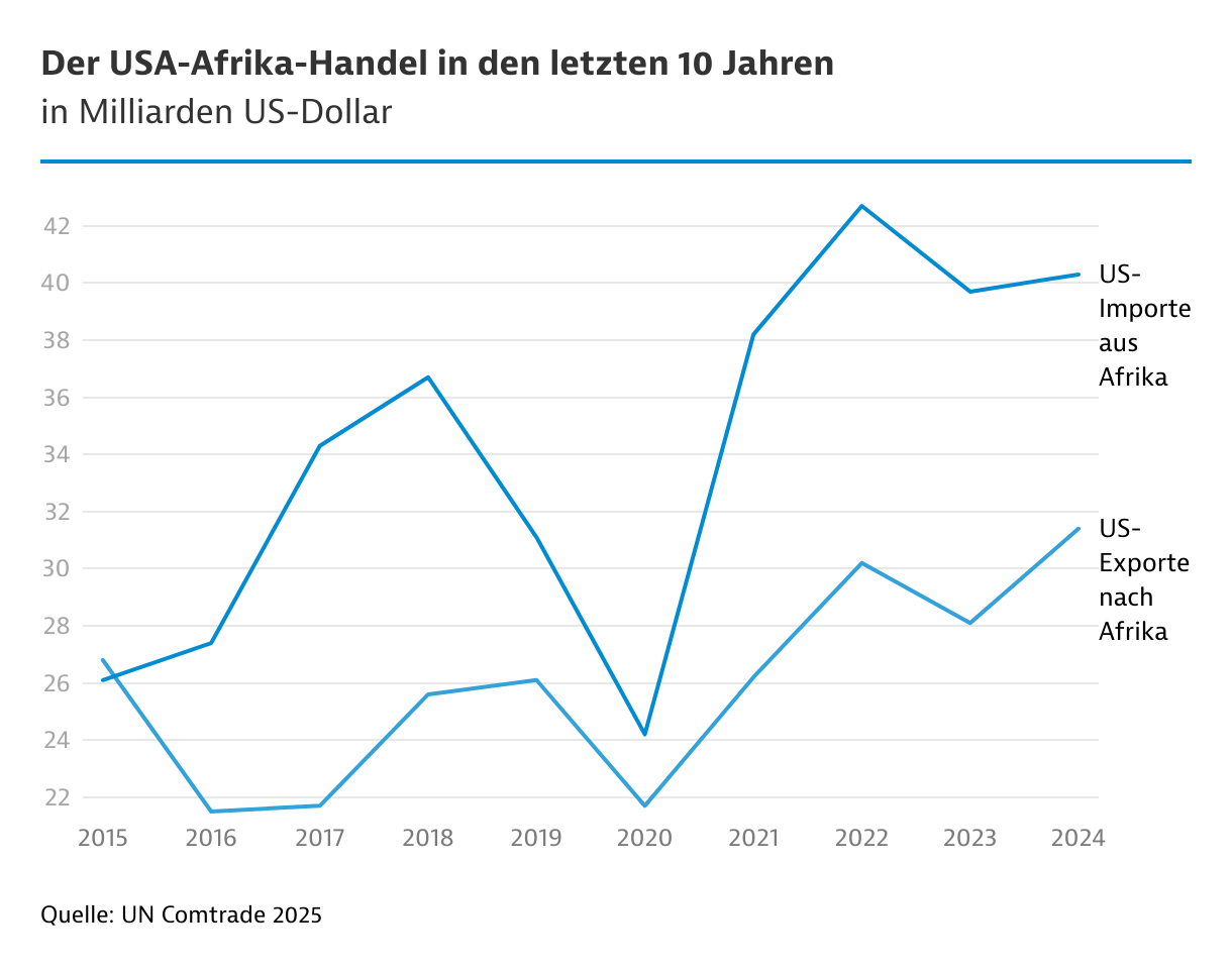 Afrikanische Märkte zählen für die USA nicht zu den Hauptexportzielen wie Mexiko, Kanada oder China, jedoch sind die US-Ausfuhren nach Afrika in den letzten Jahren stetig angestiegen. Im Güterhandel erwirtschaften die USA ein Defizit, im Plus liegen sie hingegen bei Dienstleistungen. Groß ist das Interesse an Afrikas Rohstoffen wie Platin, Gold, Mangan, Kupfer, Kobalt, Lithium und anderen kritischen Mineralien. Für die US-Regierung steht die Sicherung kritischer Rohstoffketten im Fokus, zum Beispiel über Abbaukonzessionen für US-Minengesellschaften oder über die angestrebte strategische Partnerschaft (Minerals Security Partnership) mit der DR Kongo.