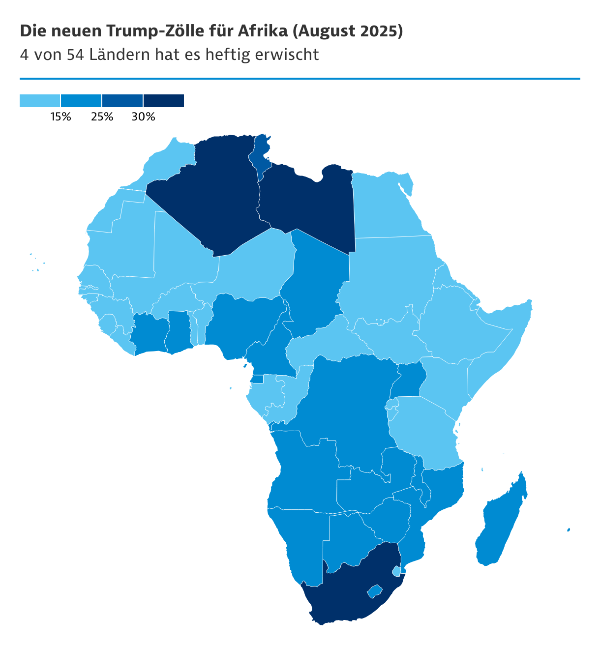 Eine ganze Reihe weiterer Länder landete bei immer noch moderaten 15 Prozent. Darunter auch Länder, die in der ersten Runde im April 2025 noch mit sehr hohen Zusatzzöllen von zwischen 32 und 50 Prozent bedacht worden waren, wie Angola, Botswana, Lesotho, Madagaskar und Mauritius. Mit Südafrika, Algerien und Libyen (alle 30 Prozent) sowie Tunesien (25 Prozent) gibt es vier "Härtefälle".
