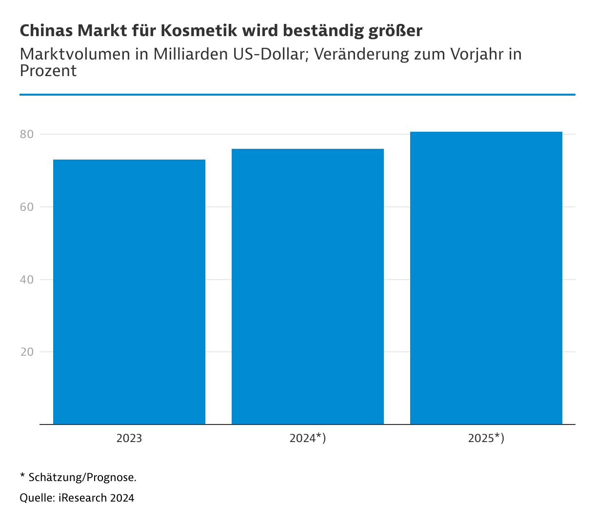 Das Marktforschungsunternehmen iResearch schätzt das Marktvolumen für 2025 auf 80,7 Milliarden US$ bei einem Wachstum zum Vorjahr von 6,1 Prozent. Die zwei Hauptsegmente sind Hautpflegeprodukte (circa 55 Prozent des Gesamtumsatzes) und Make-up (circa 12 Prozent des Gesamtumsatzes). Hautpflegeprodukte wachsen durchschnittlich um 7,5 Prozent pro Jahr, während Make-up-Produkte um 10,8 Prozent zulegen. Besonders dynamisch entwickelt sich das Segment der Hautpflegemittel für Männer, mit einem Umsatzvolumen von 2,3 Milliarden US$ im Jahr 2023 und einem Wachstum von 30 Prozent. Am stärksten nachgefragt sind Gesichtsreinigungsmittel, die 57 Prozent des Umsatzes der Hautpflegeprodukte für Männer ausmachen.