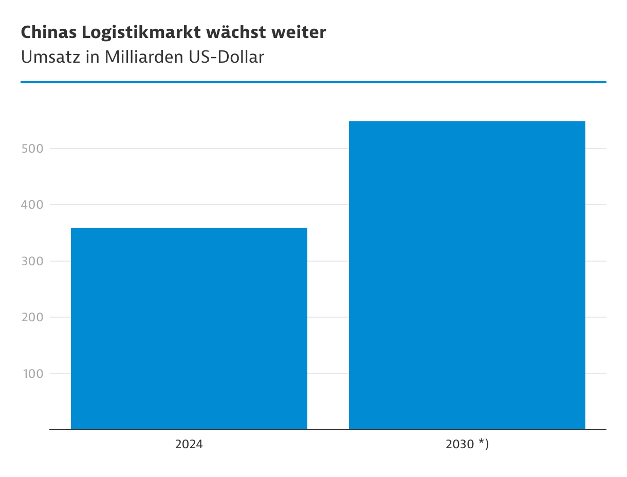 Chinas Logistikmarkt soll laut Grand View Research bis 2030 auf 548,5 Milliarden US-Dollar wachsen – mit einer jährlichen Rate von 7,3 Prozent ab 2025. Der Logistiksektor muss digitaler, effizienter und grüner werden. Ende 2024 lagen Chinas Logistikkosten bei 14,1 Prozent der Wirtschaftsleistung – fast doppelt so hoch wie in den USA oder Deutschland. Die Regierung will diesen Wert bis 2027 auf 13,5 Prozent senken und hat dazu einen umfassenden Aktionsplan vorgestellt.