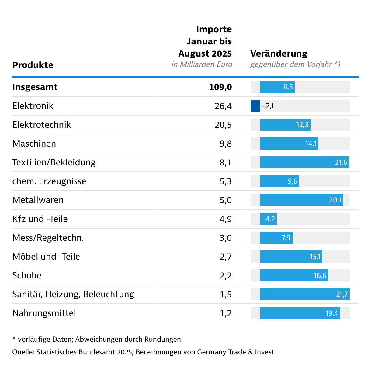 Am stärksten trugen die Bereiche Elektrotechnik, Textilien und Bekleidung, Maschinen, Metallwaren und chemische Erzeugnisse zum Importwachstum bei. Nach letztverfügbaren Angaben für die Betrachtung nach Warengruppen erhöhte sich der deutsche Bezug von Elektrotechnik aus China von Januar bis August 2025 um 2,2 Milliarden Euro, Textilien und Bekleidung um 1,5 Milliarden Euro und Maschinen um 1,2 Milliarden Euro. Der Bezug von Kfz aus China erhöhte sich hingegen nur um rund 5 Prozent, die Elektronikeinfuhr ging sogar leicht um 2,1 Prozent im Vergleich zum Vorjahreszeitraum zurück.