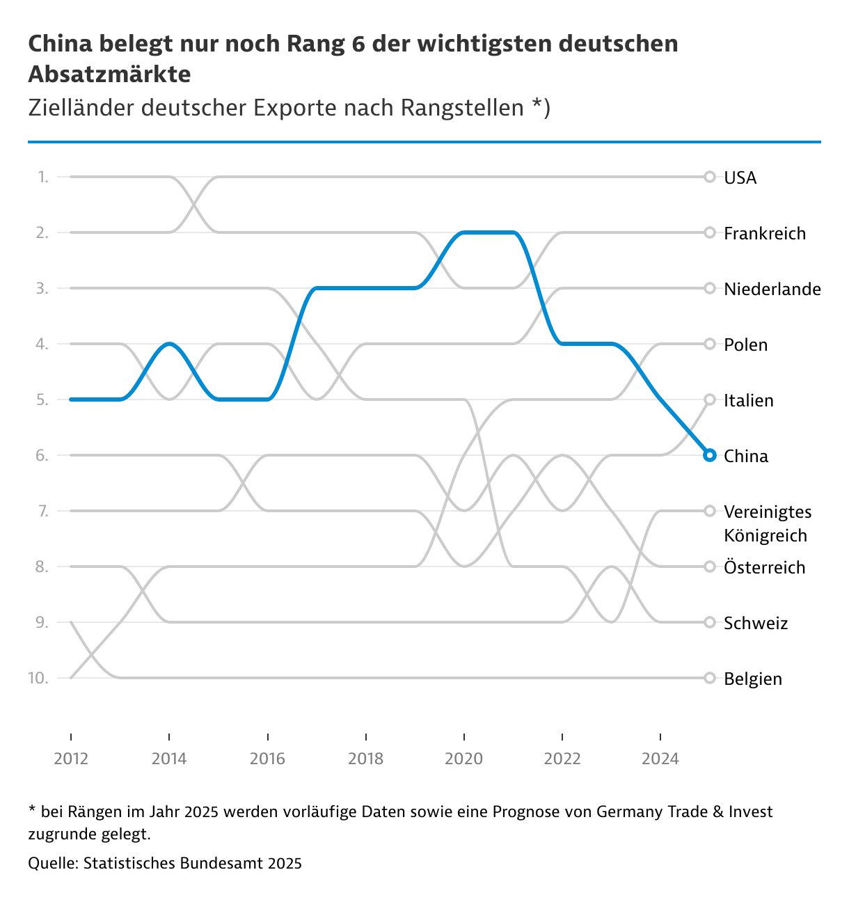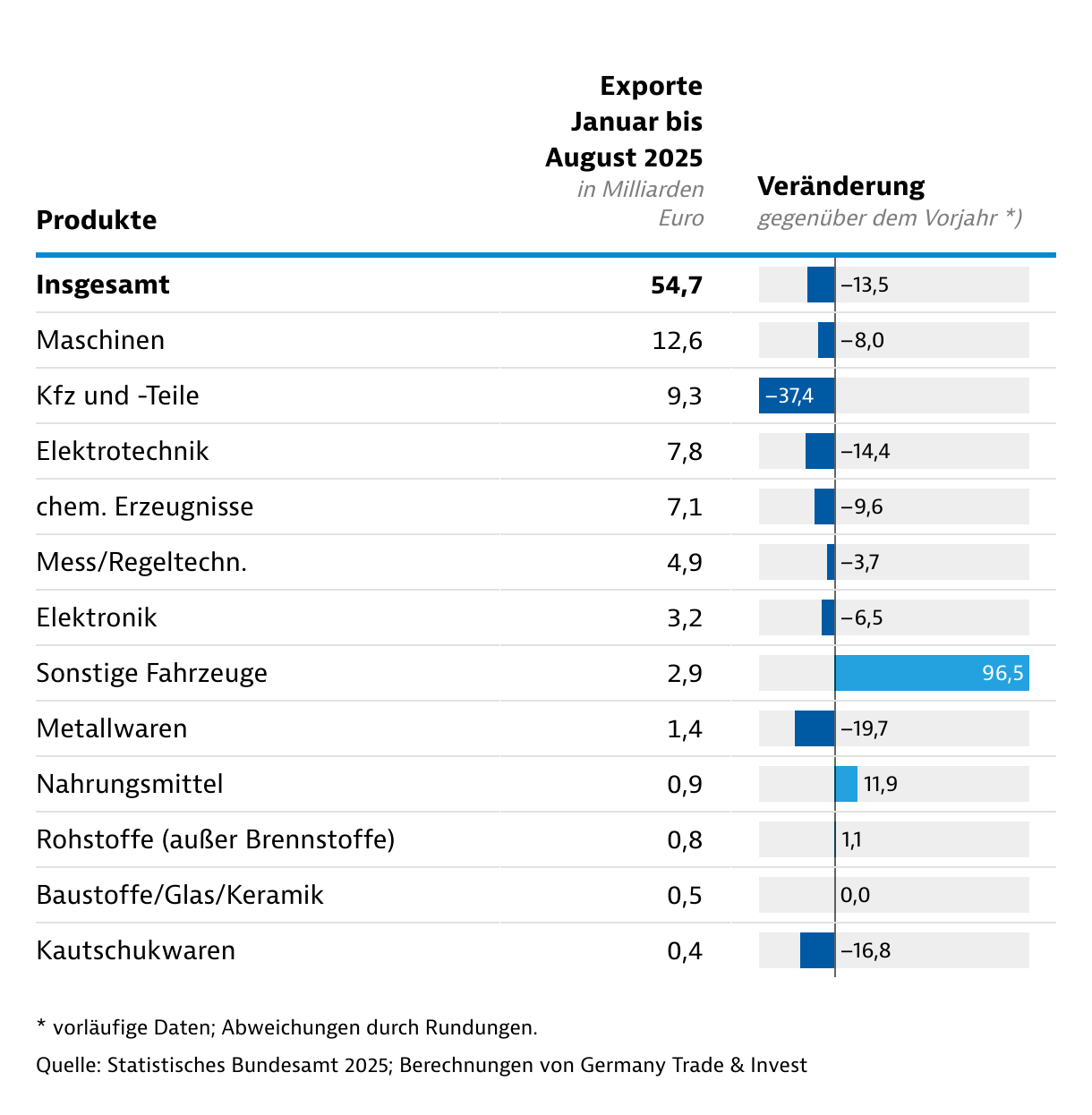 Eine frühere Hochrechnung von Germany Trade & Invest auf Basis der Außenhandelszahlen von Destatis von Januar bis August 2025 kam zu dem Ergebnis: