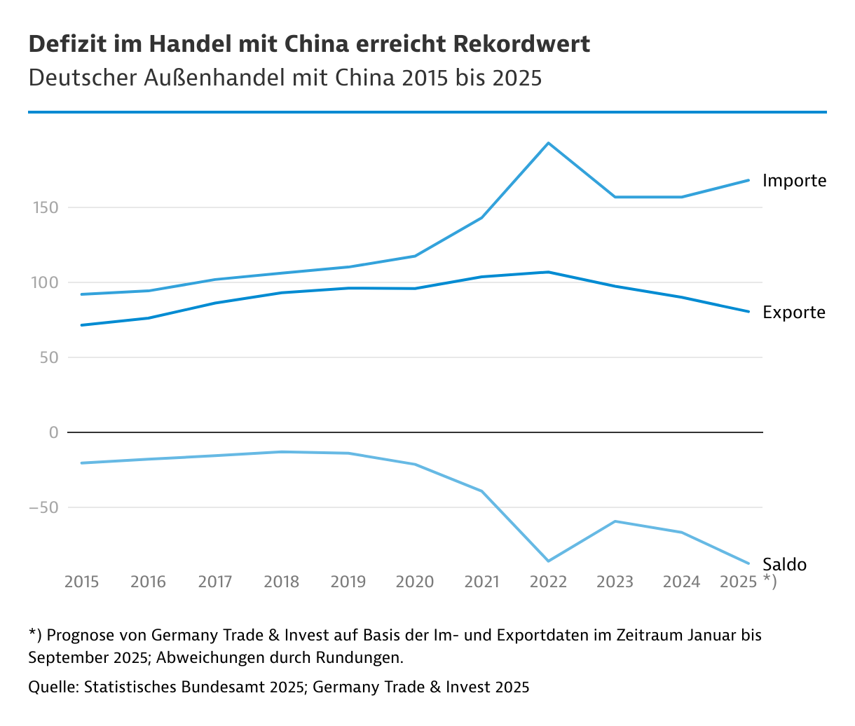 Während China für den deutschen Export an Bedeutung verliert, steigen die Importe weiter. Die Folge: Das Handelsbilanzdefizit dürfte 2025 einen Rekordwert erreichen.