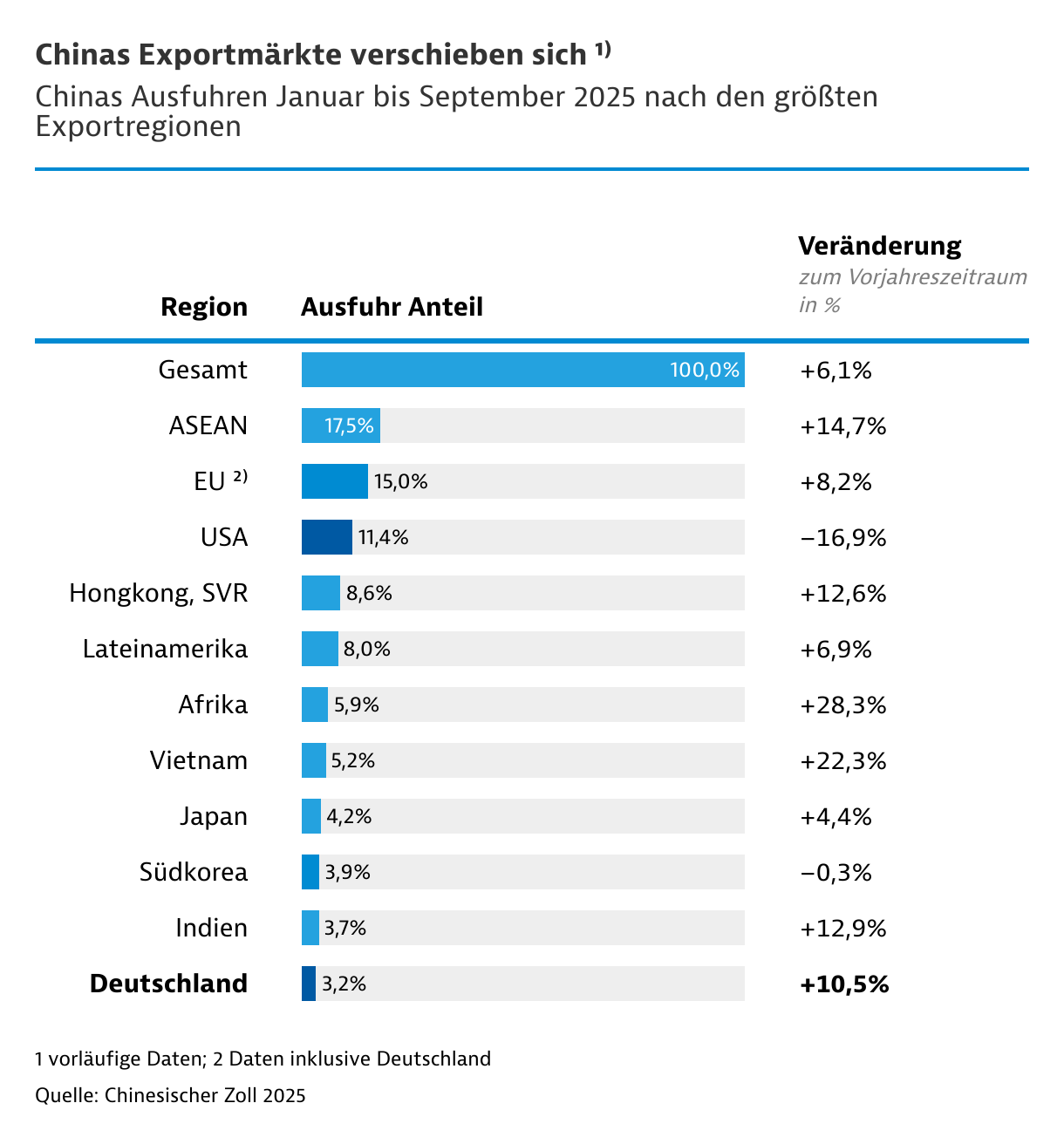 Der Handelskonflikt Chinas mit den USA bringt die zweitgrößte Volkswirtschaft dazu, ihre Abnehmermärkte zu diversifizieren. Chinas Exportdaten von Januar bis September 2025 zeigen: Während der chinesische Export in Richtung USA um 17 Prozent eingebrochen ist, ist er in den südostasiatischen Staatenbund ASEAN (+15 Prozent) und in die EU (+8 Prozent) überdurchschnittlich stark gestiegen; nach Deutschland nahm er um 11 Prozent zu.