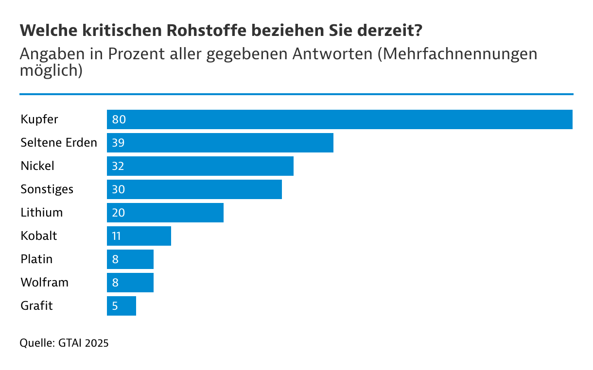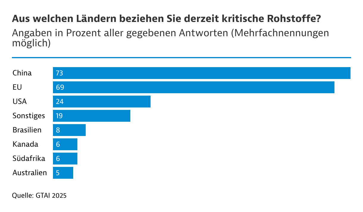 Rund zwei Drittel der an der Umfrage beteiligten Unternehmen halten ihre Rohstofflieferketten - mit Stand Sommer 2025 - für stabil oder sehr stabil, nur rund 20 Prozent für weniger stabil oder instabil. Tatsächlich reagieren die Unternehmen bereits mit Maßnahmen, um Lieferketten zu diversifizieren und sich abzeichnenden Engpässen vorzubeugen.