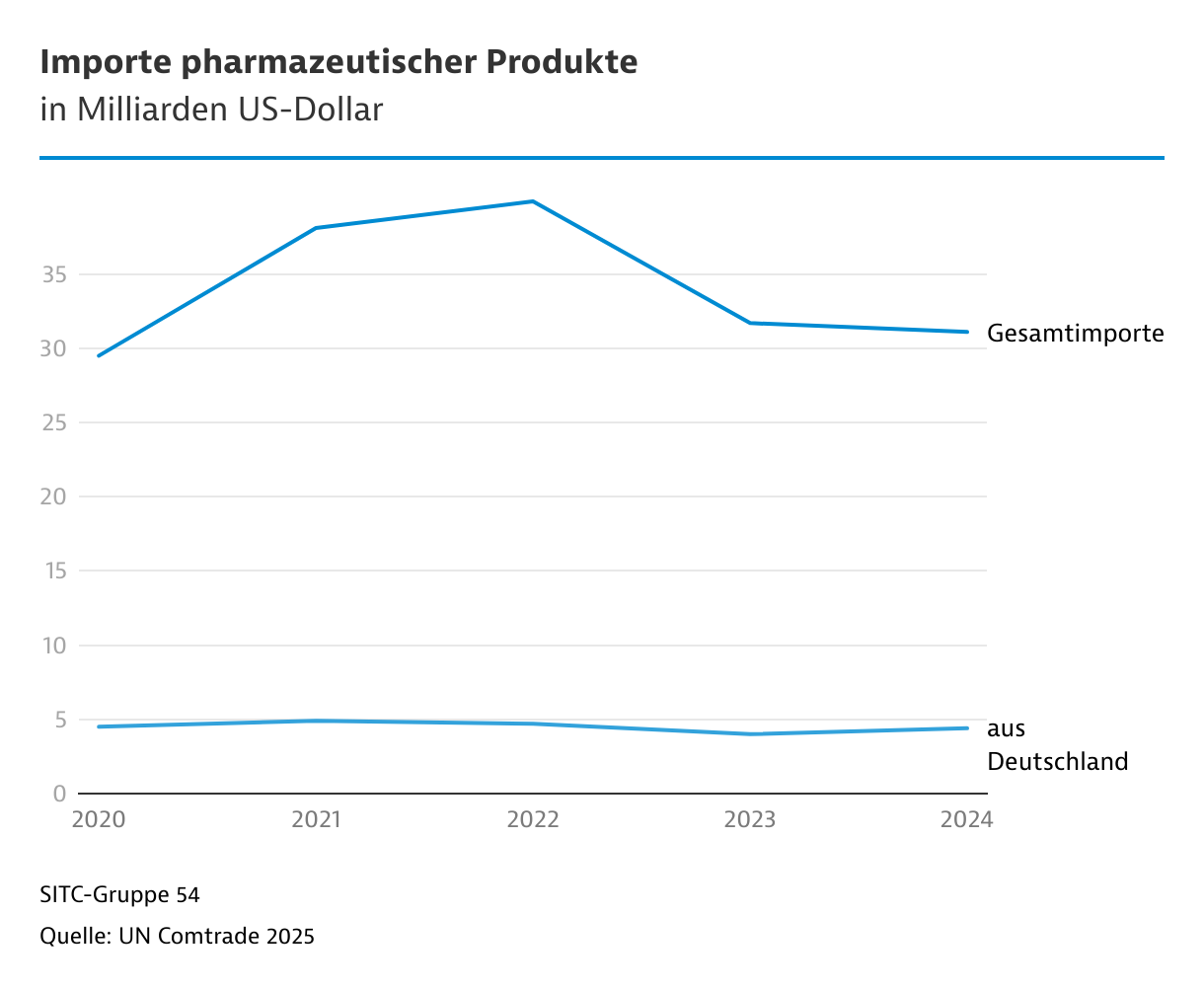 Japans Einfuhren von Pharmazeutika fielen 2024 in US$ um 1,9 Prozent. Die wichtigsten Lieferländer von Pharmazeutika nach Japan waren 2024 die USA, Deutschland, Irland und die Schweiz. Die Exporte stiegen um 1,1 Prozent auf 8,8 Milliarden US$ und gingen vor allem in die USA, die Schweiz und nach China.
