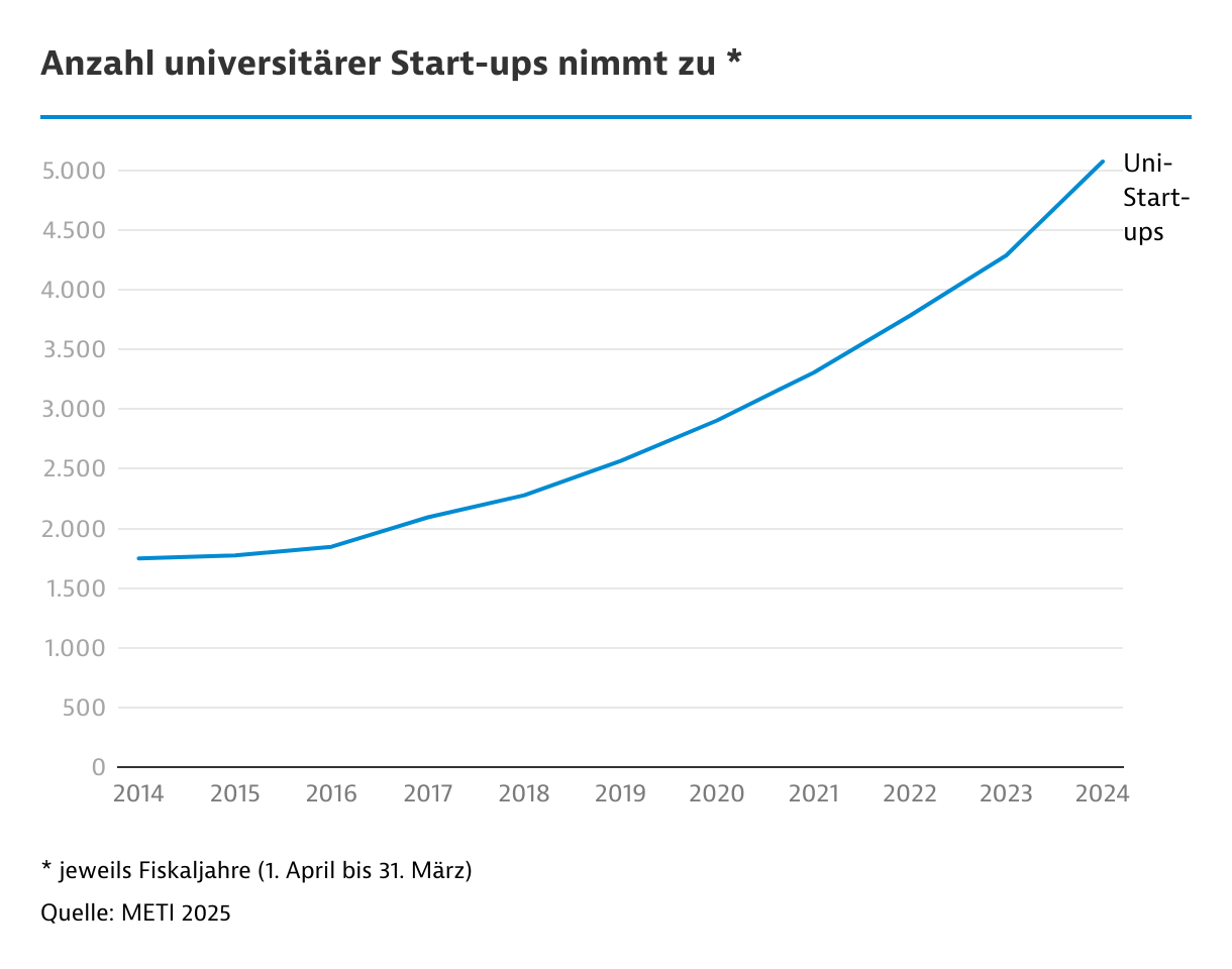 Insbesondere die Anzahl von Start-ups im universitären Umfeld stieg in den letzten Jahren stark an. Im Fiskaljahr 2024 kamen 786 neue Start-ups hinzu. Die Anzahl lag damit erstmals bei über 5.000. Die meisten Uni-Start-ups arbeiten nach einer Untersuchung von Nikkei BP Consulting in zwei Sektoren. Zum einen im Bereich Software und Applikationen für die Informationstechnologie (IT) mit 1.592 Start-ups, zum anderen mit 1.434 Start-ups das Feld Biotechnologie, Gesundheitswesen und Medizintechnik. Weitere größere Segmente bilden Start-ups mit einem Bezug zum verarbeitenden Gewerbe außerhalb von IT und Software, der Bereich Umwelttechnologie und Energie, IT-Hardware sowie der Sektor Chemie und Materialien (außerhalb der Biotechnologie).