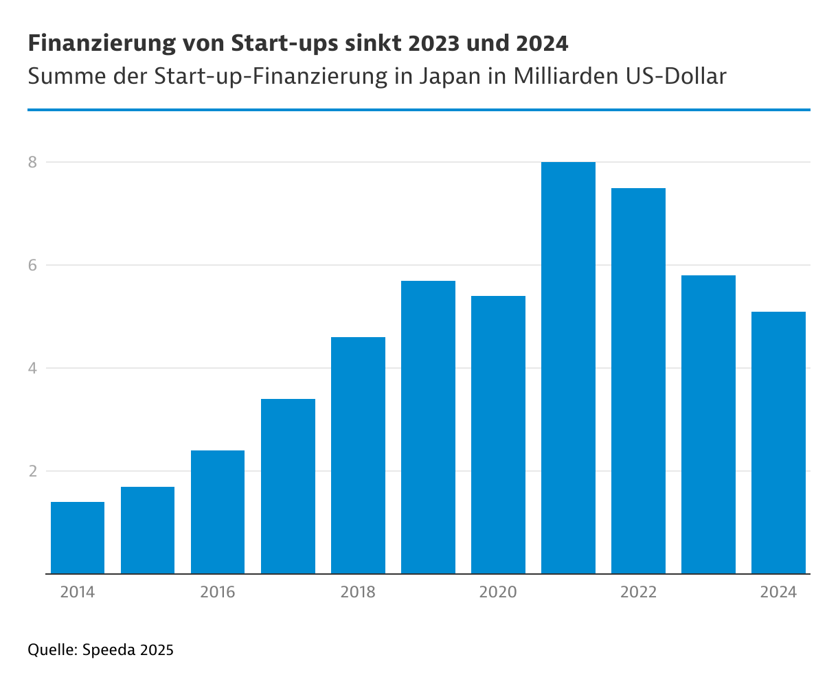 Daneben gibt es eine Vielzahl an Inkubatoren. Eine der neuen Adressen ist Station AI in Nagoya. Ebenfalls 2024 eröffnete in Japans Hauptstadt die Tokyo Innovation Base. Diese soll ebenfalls als Hub für Start-ups und Innovation dienen. Einen Überblick über viele wichtige Akteure in Japans Start-up-Ökosystem liefert eine Zusammenstellung der JETRO.