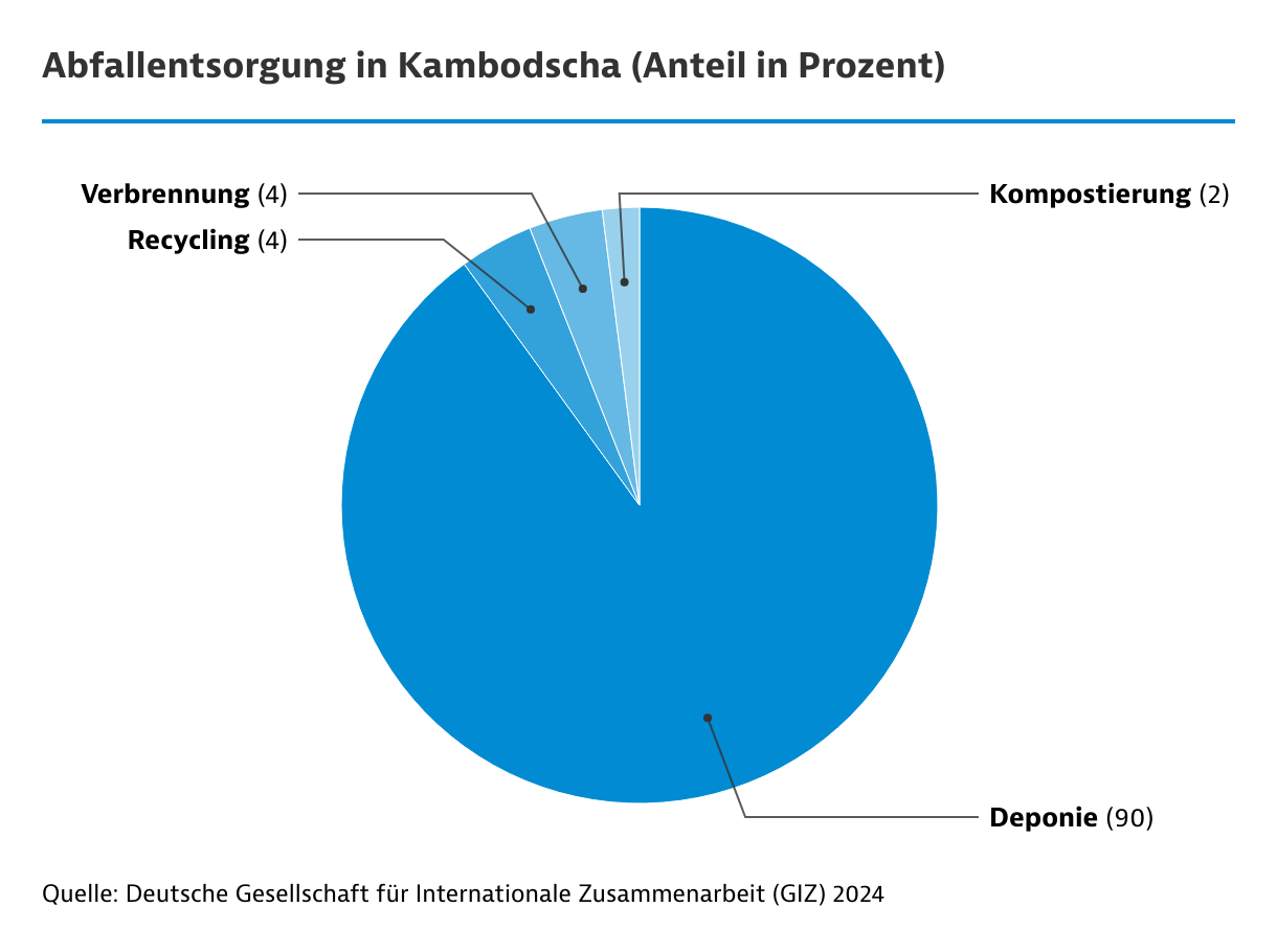 Die Abfallwirtschaft in Kambodscha kann mit der rasanten Wirtschaftsentwicklung kaum mithalten: Nur etwa 10 Prozent des gesamten Mülls werden, so Schätzungen, recycelt, kompostiert oder verbrannt. Sie befindet sich in kommunaler Verantwortung. Die meisten Städte verfügen mittlerweile über eine Müllabfuhr. In der Hauptstadt Phnom Penh ist sie teils in ausländischer Hand: Die chinesische Mizuda Group, 800 Super aus Singapur sowie das kambodschanisch-französische Unternehmen GAEA (Global Action Awareness for Environment) transportieren täglich etwa 4.000 Tonnen (t) Haushaltsmüll überwiegend zur ungesicherten und an ihre Kapazitätsgrenze gekommenen Halde Dangkor im Süden der Stadt.