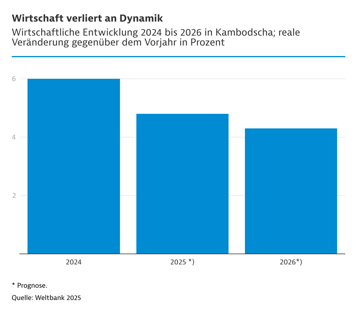 Doch die Hochkonjunktur hat vorerst ein Ende. Der IWF prognostiziert von 2025 bis 2028 nur noch jährliche Wachstumsraten von 4 bis 5 Prozent – damit liegt Kambodscha nur noch im ASEAN-Durchschnitt.