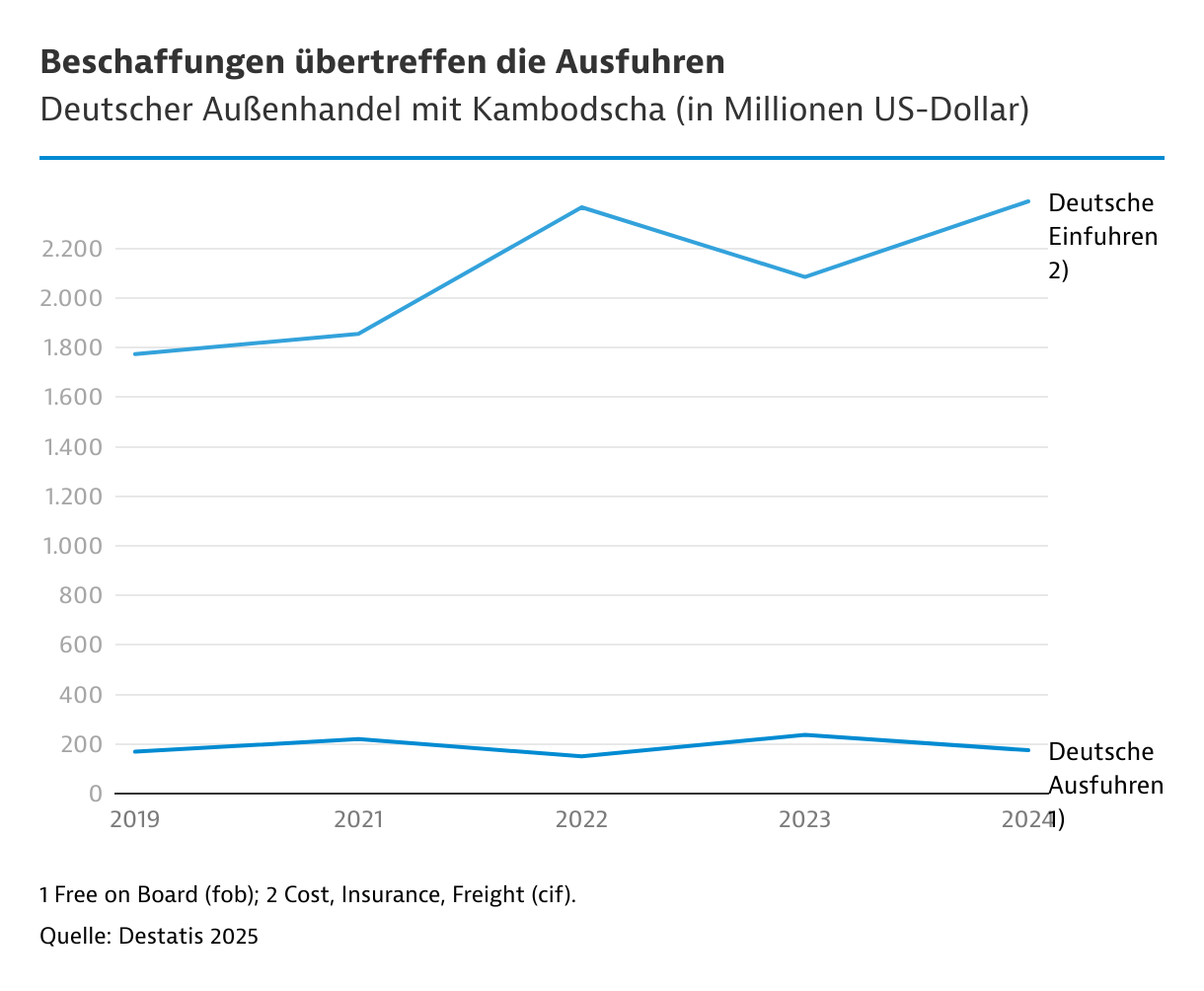 Kaufkraft und Nachfrage nach Hightech sind zwar noch gering. Das Land rangierte 2024 auf Platz 114 unter den deutschen Exportdestinationen. Dennoch stiegen die deutschen Ausfuhren Januar bis Oktober 2025 um knapp 30 Prozent gegenüber dem Vorjahreszeitraum. In der Getränkeindustrie sind deutsche Maschinen gefragt. In Supermarktregalen finden sich Snacks mit deutscher Flagge. Deutsche Luxusautos fahren auf den Straßen und Bosch beliefert Kfz-Werkstätten. Ein deutsches Handelshaus betreibt eine erfolgreiche Repräsentanz und ein deutscher Sportartikelhersteller gibt über seine Vertragsfabriken bis zu 80.000 kambodschanischen Beschäftigten Arbeit.