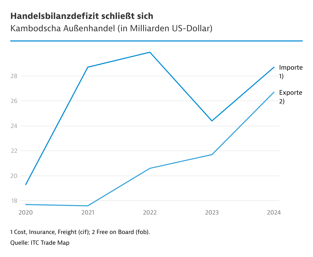 Die Säulen des Booms, die informelle Ökonomie und die Exportwirtschaft, stehen unter Druck. Die USA sind der wichtigste Absatzmarkt und haben Importe aus Kambodscha mit Zusatzzöllen von 19 Prozent belegt. Die regionalen Wettbewerber bekamen ähnlich hohe - Indien sogar noch höhere Zölle - auferlegt, daher bleibt die Wettbewerbsfähigkeit erhalten.