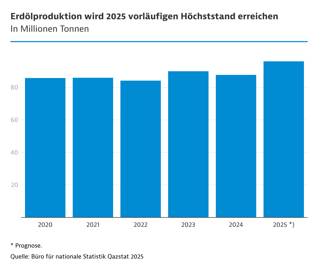 Besonders wichtig ist die Ölförderung. Sie wird 2025 vor allem dank des Hochfahrens der Produktion der Tengiz-Lagerstätte im Gebiet Atyrau deutlich zunehmen. Das Betreiberkonsortium des wichtigsten Ölfelds des Landes konnte ein größeres Erweiterungsprojekt jüngst erfolgreich abschließen. Andere Ölfirmen haben weitere Erkundungen und Ausbauprojekte für die nächsten Jahre angekündigt.