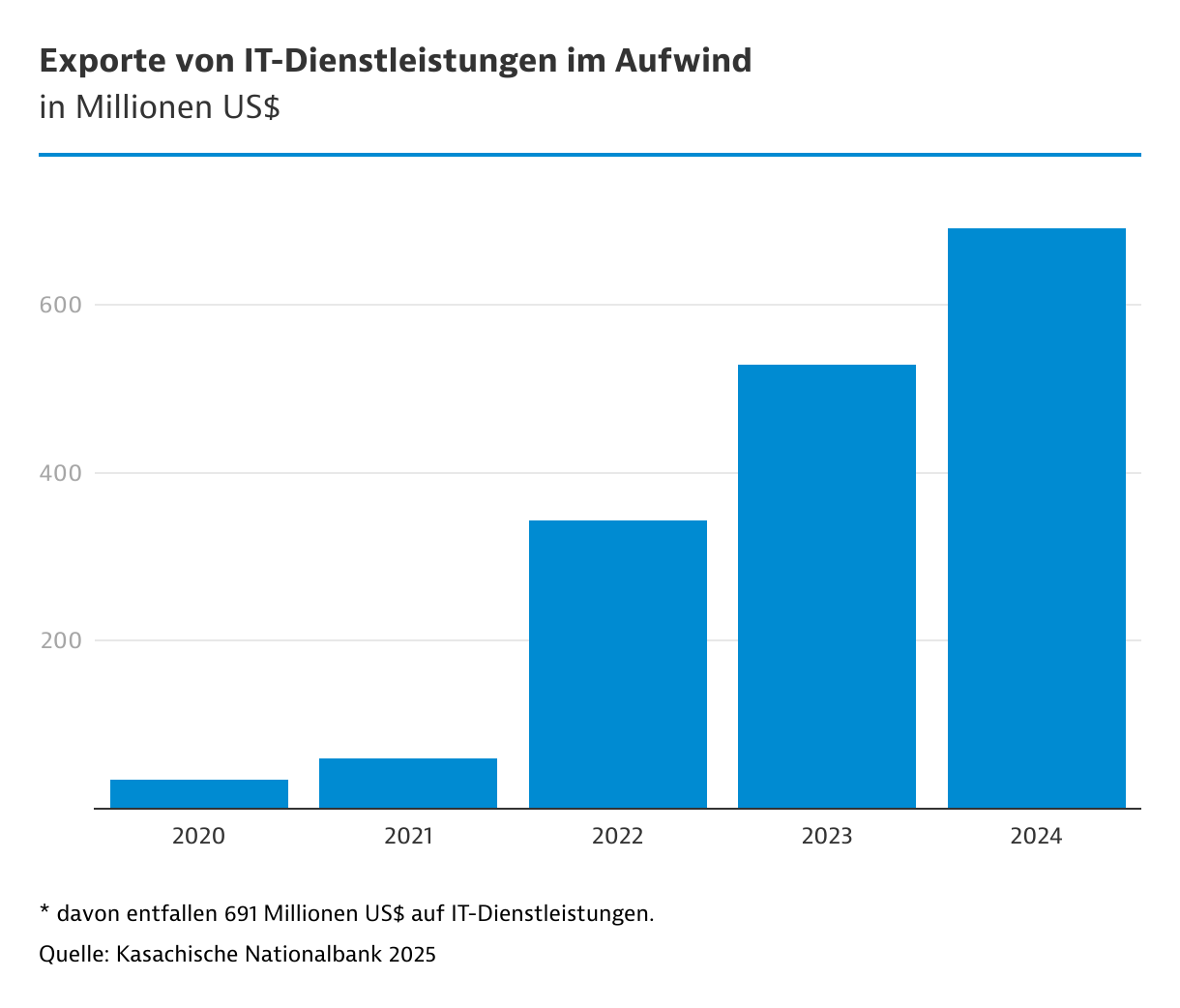 Aus Kasachstan in die Welt sollen zukünftig vermehrt IT-Dienstleistungen exportiert werden. Auch deutsche Unternehmen gehören schon zum Kundenstamm. Die Exporte von IT-Diensten sind seit Jahren im Aufwind. Im Jahr 2024 stiegen sie um 30 Prozent gegenüber dem Vorjahr auf fast und überstiegen damit erstmals die Importe. Mehr als zwei Drittel der Exporte entfielen auf das Astana Hub, Kasachstans wichtigsten Technologiepark. Dort sind über 1.500 Unternehmen registriert, darunter rund 400 mit ausländischer Beteiligung. Das ehrgeizige Ziel für 2026 ist es, die 1-Milliarde-US$-Marke zu knacken.