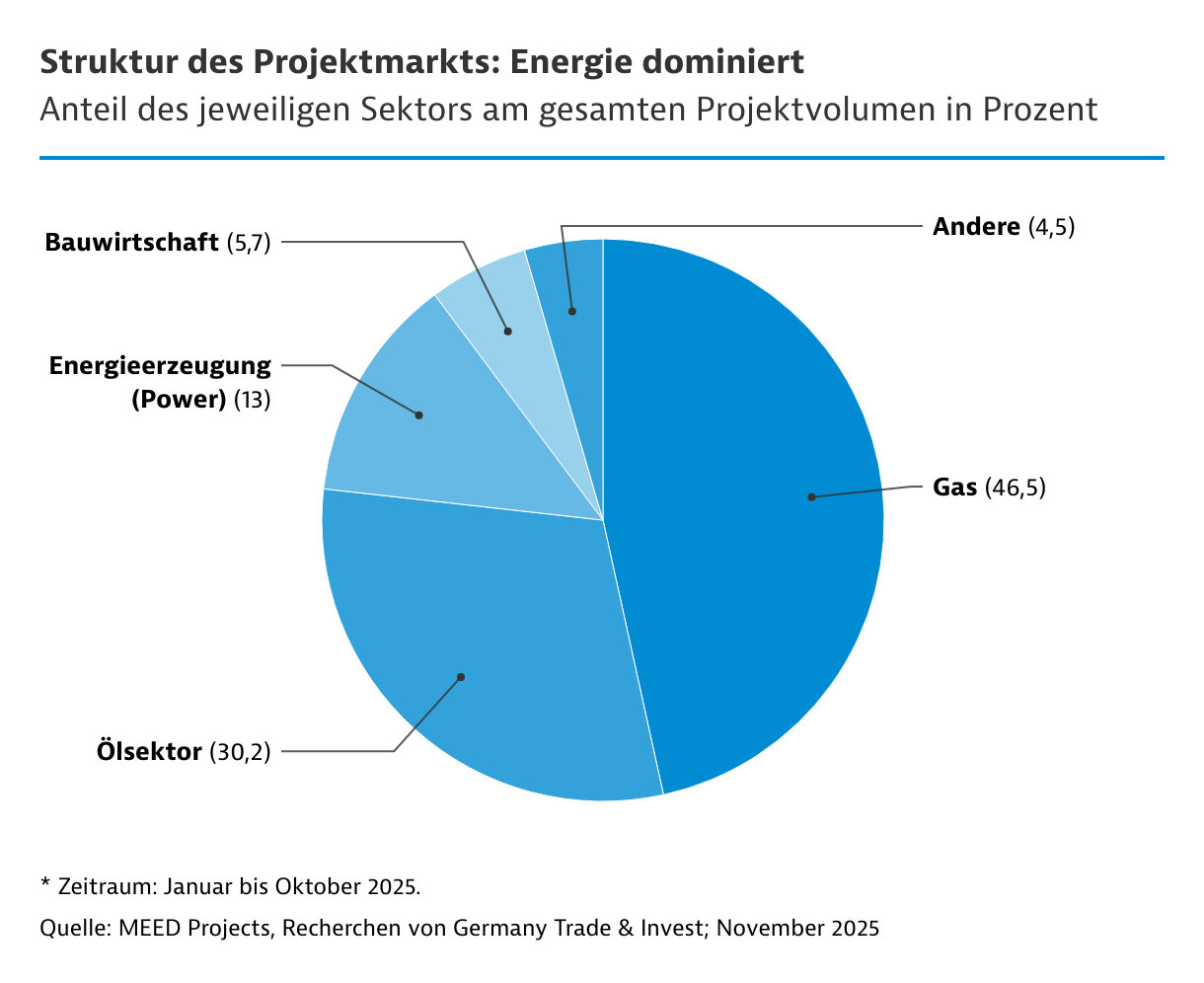 Von Januar bis Oktober 2025 dominierten Gasprojekte die Ausschreibungen. Der größte Anteil der neu vergebenen Aufträge entfiel auf LNG- und Pipelinevorhaben. Bezieht man die geplanten Projekte ein, zeigt sich ein breiteres Bild: Laut MEED Projects standen im November 2025 im Transportsektor Vorhaben im Wert von rund 54,8 Milliarden US-Dollar in Planung oder Umsetzung. Mit einem Anteil von etwa 40 Prozent bildet er das aktuell wichtigste Segment. Es folgen der Bausektor mit rund 28 Prozent und der Gassektor mit etwa 22 Prozent des gesamten Projektvolumens.