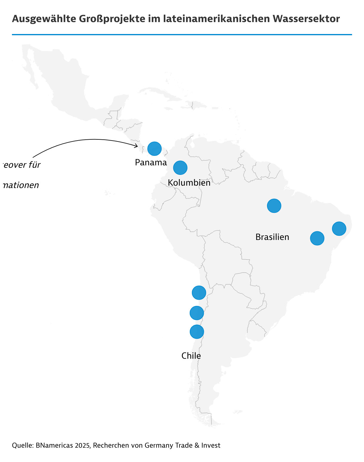 Daneben gewinnt die Meerwasserentsalzung in Lateinamerika an Bedeutung, allen voran in Chile und Peru. Treiber sind vor allem Bergbauprojekte und langfristige Vorhaben zur Gewinnung von grünem Wasserstoff. Zugleich stehen Entsalzungsanlagen für die Bevölkerung im Fokus: Die Vergabe für den Bau eines neuen Trinkwassersystems in Lima (486 Millionen US$) Anfang 2026 sowie eine neue Meerwasserentsalzungsanlage bieten künftig Absatzchancen für deutsche Firmen. Auch Brasilien plant den Bau einer großen Meerwasserentsalzungsanlage im Bundesstaat Ceará.