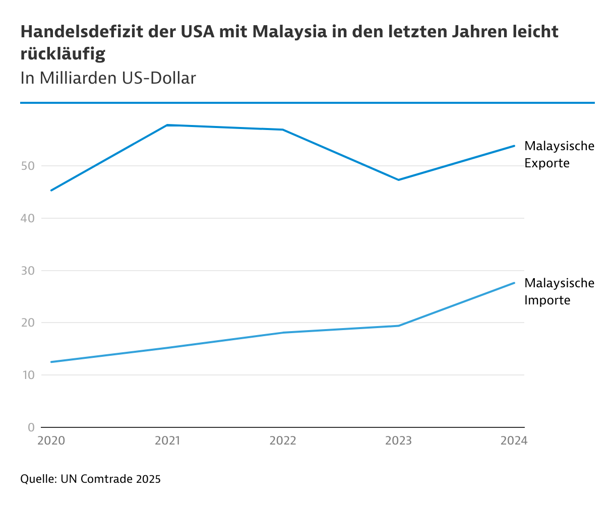 Entsprechend groß war der Druck, malaysischen Unternehmen weiterhin Zugang zum wichtigen US-Markt zu verschaffen. In monatelangen Verhandlungen gelang es schließlich, den von US-Präsident Trump am Liberation Day im April 2025 verkündeten reziproken Zusatzzollsatz auf malaysische Importe von 24 auf 19 Prozent nach unten zu korrigieren. Zudem konnten nach Aussagen des malaysischen Handelsministeriums für 1.711 Produkte mit einem Exportwert von zuletzt 5,2 Milliarden US$ geringere Zollsätze erwirkt werden, darunter für wichtige Ausfuhrgüter wie Halbleiter, Palmöl und Gummierzeugnisse.