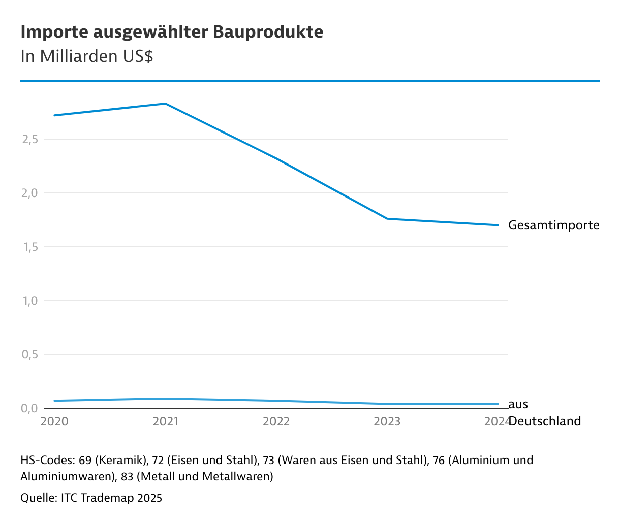 Deutsche Unternehmen wie Knauf und Heidelberg Materials sind vor Ort vor allem im Bereich Baustoffe tätig. Geschäftschancen können sich für deutsche Firmen des Weiteren bei Ingenieurs- und Architekturdienstleistungen und als Zulieferer von Baumaschinen und Werkzeugen ergeben.