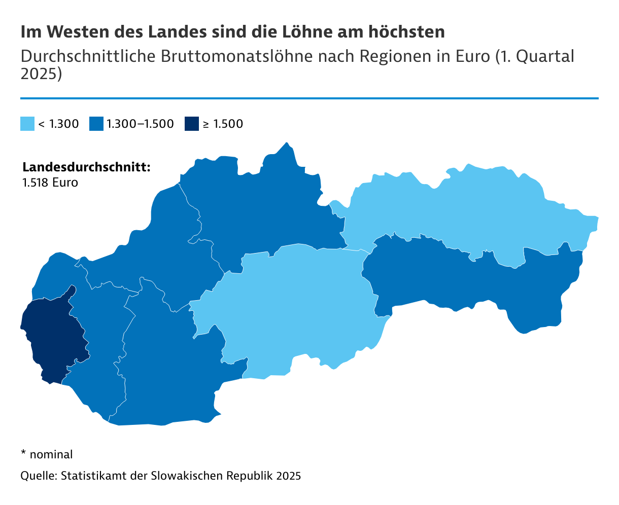 Das wirtschaftliche West-Ost-Gefälle der Slowakei spiegelt sich im Lohnniveau. Im Bezirk Prešov lag der Durchschnittslohn im 1. Quartal 2025 um 22 Prozent unter dem Landesdurchschnitt. Durch gezielte Wirtschaftsförderung und das bessere Personalangebot gehen Investoren immer häufiger in die Ost- und Zentralslowakei. Dadurch wächst auch dort der Wettbewerb um Personal. In der Region Košice erhöht die Großinvestition von Volvo Cars den Bedarf. Laut slowakischen Zeitungsberichten stellt der Autobauer allein 2025 rund 1.000 Arbeitskräfte ein. Das Einstiegsgehalt für einen Fertigungsingenieur soll bei 2.300 Euro brutto liegen, für Wartungstechniker bei 1.450 Euro.