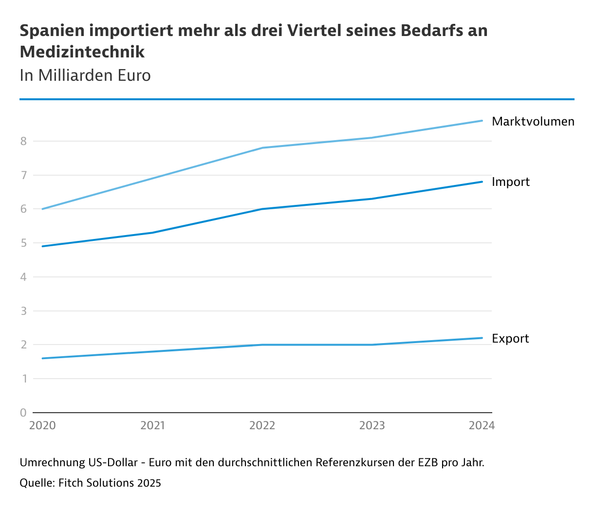 Die Marktanalysefirma Fitch Solutions prognostiziert eine durchschnittliche Wachstumsrate des spanischen Medizintechnikmarkts in den Jahren 2024 bis 2029 von jährlich 5,9 Prozent. Die Steigerungsrate ist damit höher als beim Absatz von Medikamenten, die Fitch mit jährlich 3 bis 4 Prozent im selben Zeitraum beziffert. Im europäischen Vergleich weist Spanien im Bereich Medizintechnik noch Entwicklungspotenzial auf: Die Pro-Kopf-Ausgaben lagen im Jahr 2024 bei rund 180 Euro, während der europäische Durchschnitt laut dem Verband MedTech Europe bei 320 Euro lag. Wie auch im Pharmasektor, führen Sparzwänge im öffentlichen Gesundheitssystem dazu, dass die Ausgaben streng kontrolliert werden.