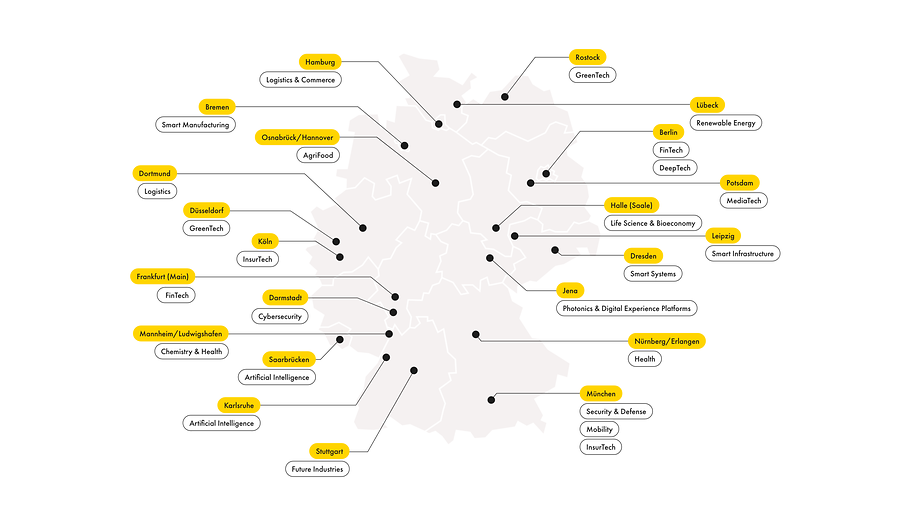Zu den de:hubs gehören Berlin (FinTech & DeepTech), Dortmund (Logistik), Dresden (Smart Systems), Leipzig (Smart Infrastructure), Frankfurt (FinTech), Darmstadt (Cybersecurity), Hamburg (Logistik & Handel), Karlsruhe (Künstliche Intelligenz), Köln (InsurTech), Mannheim/Ludwigshafen (Chemie & Gesundheit), München (Mobility, InsurTech & Sicherheit & Verteidigung), Nürnberg/Erlangen (Gesundheit), Potsdam (MediaTech), Stuttgart (Future Industries), Rostock/Greifswald (GreenTech), Lübeck (Erneuerbare Energien), Saarbrücken (Künstliche Intelligenz), Halle (Life Science & Bioeconomy), Jena (Photonik & Digitale Erlebnisplattformen), Bremen (Smart Manufacturing), Osnabrück/Hannover (AgriFood), und Düsseldorf (GreenTech).