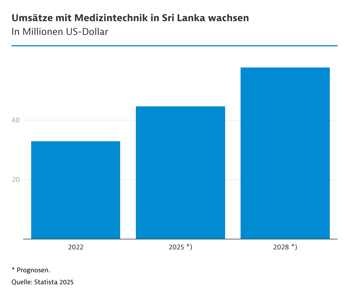 Infolge des Staatsbankrotts 2022 und der anschließenden Wirtschaftskrise brachen die Umsätze mit medizinischen Geräten zunächst deutlich ein. Es wurde nur in geringem Umfang in die Gesundheitsversorgung investiert und nur wenig Medizintechnik importiert. Das Datenportal Statista schätzt die Branchenumsätze im Jahr 2025 auf rund 294 Millionen US$. Die Experten prognostizieren, dass sie weiter steigen und im Jahr 2028 um 26 Prozent über dem Niveau von 2025 liegen werden. Alle Produktgruppen dürften Zuwächse verzeichnen.