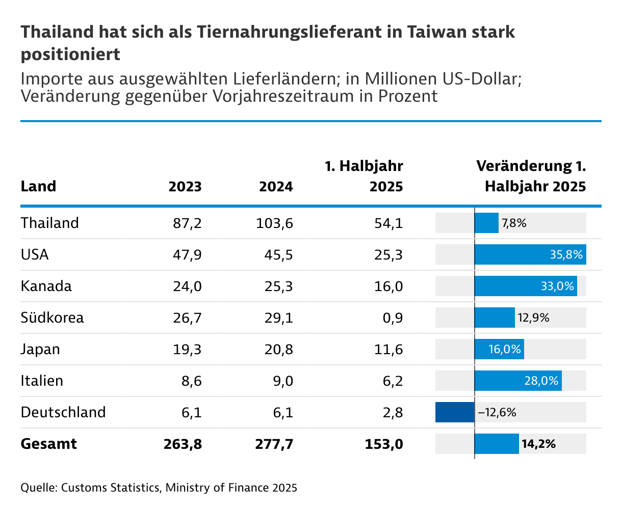 Taiwan importiert einen steigenden Anteil seiner Tiernahrung. Marktführer sind Marken aus Thailand, vor allem Charoen Pokphand, und aus den USA, beispielsweise Mars. Aus Deutschland ist etwa Heristo als Lieferant vertreten. Für andere Haustiererzeugnisse sind die Einfuhren schwer zu erfassen, da sie sich auf unterschiedliche Zollgruppen verteilen.