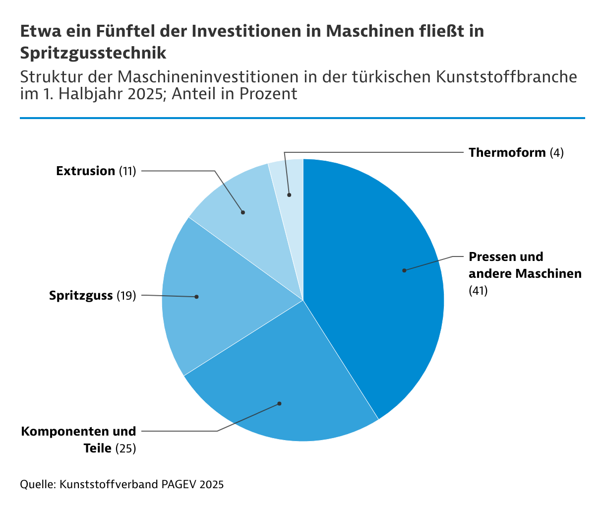 Mittelfristig erwartet PAGEV deutliche Investitionen der Kunststoffhersteller in ihre Maschinenparks. Dies eröffnet auch gute Geschäftschancen für deutsche Anbieter, denn importierte Technik dominiert den Markt zu rund 70 Prozent. Im 1. Halbjahr 2025 belief sich der Gesamtwert der Maschinenimporte auf 339 Millionen US$. Etwa die Hälfte stammte aus China. Deutschland folgte als zweitwichtigstes Lieferland mit einem Anteil von 19 Prozent, vor Italien, Österreich, Japan und der Schweiz. Der Markt bleibt preissensitiv. Branchenkenner berichten, dass viele türkische Kunststoffhersteller statt neuer Technik günstige Gebrauchtmaschinen importieren.