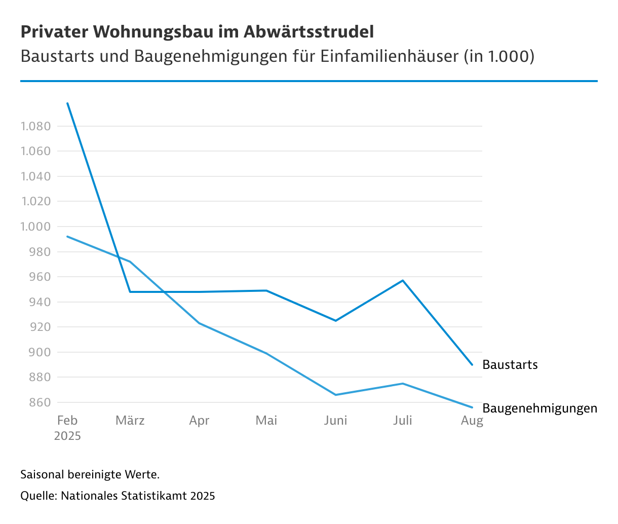 Der private Wohnungsbau ist die mit Abstand größte Sparte des gesamten Bausektors. Seine Schwäche ist besonders ausgeprägt. Wer um seinen Arbeitsplatz bangt, der baut in der Regel kein neues Haus. Die Anzahl der Baugenehmigungen für Einfamilienhäuser ist zwischen Februar und August 2025 um 13 Prozent zurückgegangen. Bei den Baustarts betrug der Rückgang sogar 19 Prozent. Immer mehr Haushalte zögern den ersten Spatenstich trotz vorliegender Genehmigung hinaus.