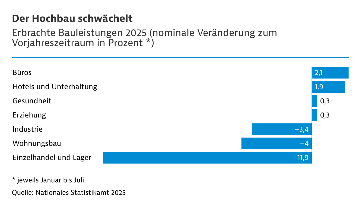 Laut dem nationalen Statistikamt nahm der Wert der erbrachten Bauleistungen in den ersten sieben Monaten 2025 um nominal gut 2 Prozent gegenüber dem Vorjahreszeitraum ab. Die Inflation eingerechnet, ergibt sich damit ein realer Rückgang von rund 5 Prozent. Besonders ausgeprägt war die Schwäche im Hochbau. Dort wies keine einzige Sparte einen Realzuwachs auf.