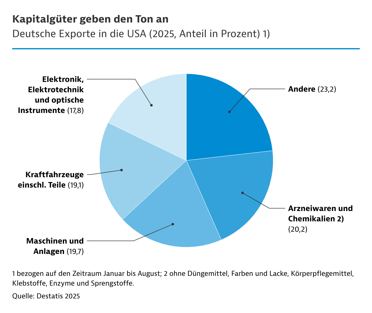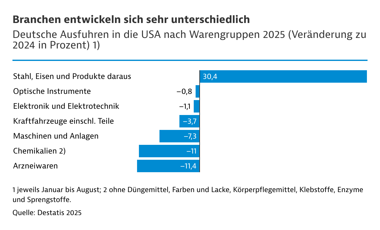 Doch die US-Zollpolitik setzt deutsche Firmen unter Druck. Für Unmut sorgt nicht nur der allgemeine Zollsatz von 15 Prozent, sondern auch der anteilige Zoll von 50 Prozent auf Stahl und Aluminium sowie deren Derivate. Der EU ist es zwar gelungen, wichtige Branchen wie die Kfz-Industrie davon auszunehmen. Doch der mittelständische Maschinenbau wird weiter stark belastet: Der Verband Deutscher Maschinen- und Anlagenbau (VDMA) beklagt, dass bis zu 40 Prozent aller deutschen Maschinenlieferungen in die Vereinigten Staaten davon betroffen sind. Ab dem 1. Januar 2026 soll die Zollliste erweitert werden, sodass die Quote weiter steigen wird.