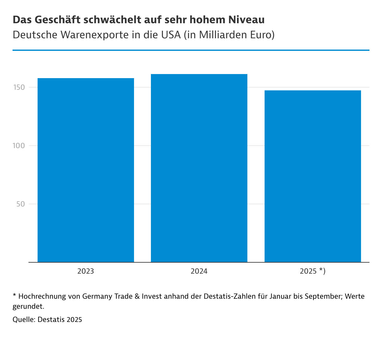 Die deutschen Ausfuhren in die USA könnten 2025 um 8 bis 9 Prozent sinken. Auch 2026 rechnet GTAI mit Einbußen. Doch trotz der Rückgänge bleiben die Exporte auf einem hohen Niveau.