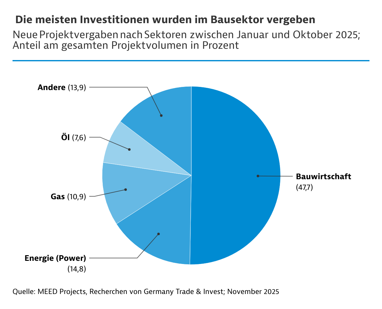 Deutsche Unternehmen stellen mit einem Marktanteil von rund 0,3 Prozent zwar nur eine kleine Gruppe, sind jedoch in technologisch anspruchsvollen Nischen stark vertreten – etwa bei energieeffizienter Gebäudetechnik, Industrieanlagen, erneuerbaren Energien und Smart-City-Lösungen. "Anstatt als Generalunternehmer treten sie meist als Technologiepartner oder Unterauftragnehmer in internationalen Konsortien auf", erläutert Markus Brandt, Senior Manager der AHK VAE.