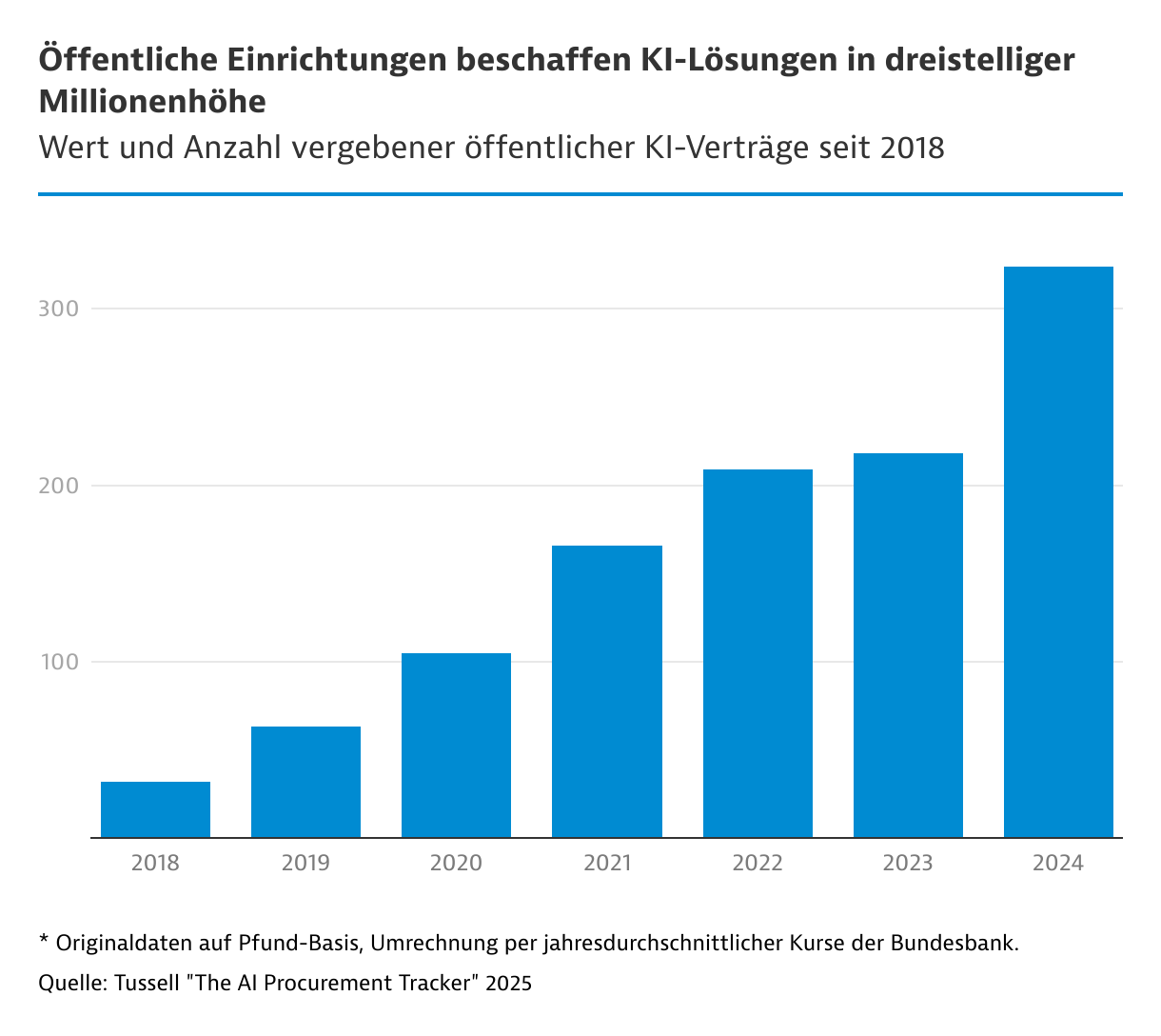 Seit 2018 hat die öffentliche Hand bereits über 1.300 Verträge über KI-Leistungen im Wert von umgerechnet knapp 4 Milliarden Euro geschlossen, wie der "AI Procurement Tracker" des Dienstleisters Tussell bis Juli 2025 zeigt. Allein in der ersten Hälfte des Jahres 2025 war das Auftragsvolumen mit 662,5 Millionen Euro höher als für das gesamte Vorjahr (552,8 Millionen Euro). Wertmäßig gingen die meisten Aufträge an Microsoft (circa 1,2 Milliarden Euro), Palantir (über 432 Millionen Euro) und Init (etwa 300 Millionen Euro). Hinter der Dominanz von Microsoft steckt die Beschaffung des Supercomputers für das britische Met Office im Projekt "Supercomputing 2020+", das im Mai 2021 an den US-Konzern vergeben wurde. In dem Projekt werden mit einem Gesamtvolumen von 1,4 Milliarden Euro über den Zeitraum 2021 bis 2032 die Supercomputer des staatlichen meteorologischen Instituts erneuert.