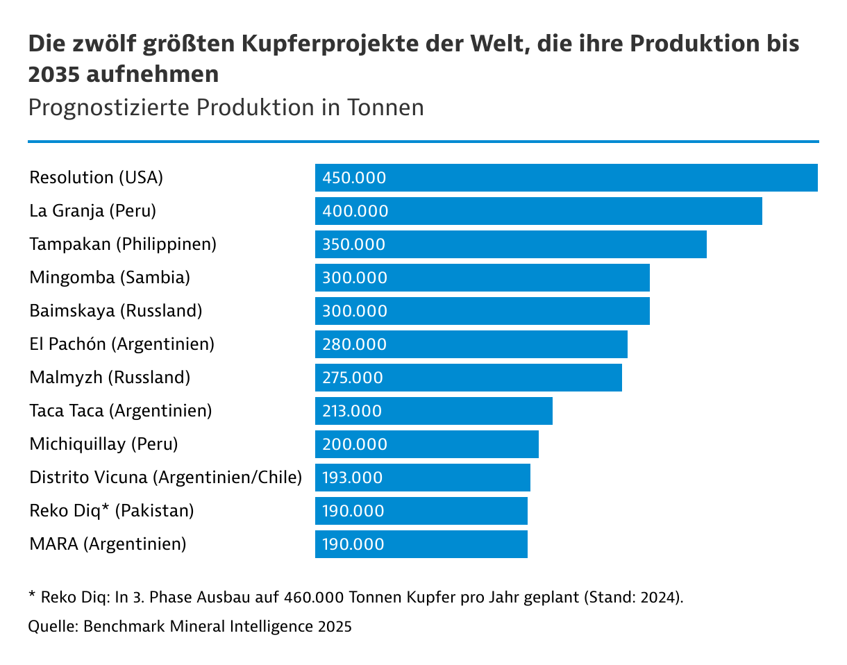 Von den zwölf größten Kupfer-Greenfield-Projekten der Welt, die bis 2035 in Betrieb gehen sollen, befinden sich zwei in Peru und vier in Argentinien. Mit den neuen Vorhaben könnte Argentinien jährlich fast 1,2 Millionen Tonnen Kupfer produzieren. Zu den wichtigsten Projekten zählen Glencore`s El Pachòn (jährliche Produktion: 280.000 Tonnen) und MARA/Agua Rica (190.000 Tonnen), First Quantum`s Taca Taca (213.000 Tonnen), BHP/Lundin´s Distrito Vicuña (193.000 Tonnen) und McEwen´s Loz Azules (146.056 Tonnen). Mit seiner rasch wachsenden Kupferpipeline positioniert sich Argentinien als ernstzunehmender Akteur bei der Deckung des weltweit wachsenden Kupferbedarfs.