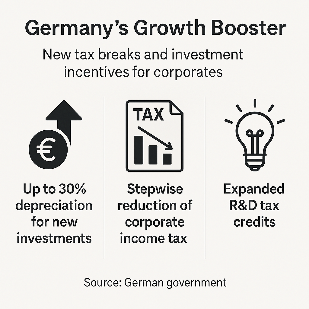 The growth booster package brings in more generous depreciation allowances and a phased reduction in corporate tax rates. The immediate and eventual cuts are aimed at enhancing Germany’s competitiveness, innovation, and appeal to international companies. And they’re part of a wider effort to encourage German enterprise to increasingly spur growth in the country.