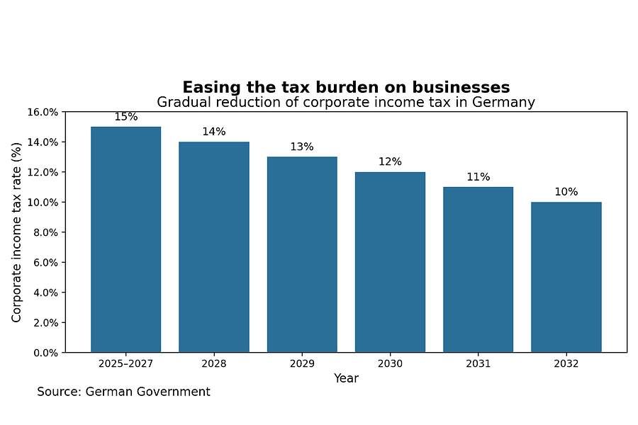 The growth booster reduces the overall tax burden for corporations, with rates set to fall incrementally over the next few years. From 2028 onwards, the corporate income tax rate will be reduced by one percentage point a year – from the current 15 percent to 10 percent. The German government expects the overall tax burden on companies to fall from around 30 percent at present to around 25 percent in 2032.